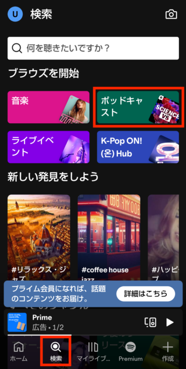 1. 画面下部の検索ボタンをタップし、ブラウズを開始から「ポッドキャスト」を選択