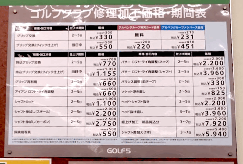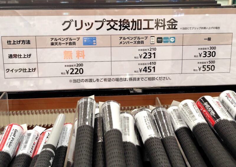 たとえば、グリップ交換の工賃が1本あたり330円なので、14本交換すると4,620円かかります。しかし、カード会員であれば、この交換工賃が無料です。