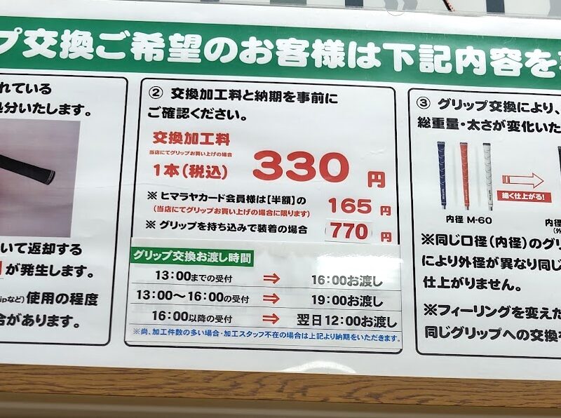 ヒマラヤゴルフのグリップ交換は、仕上げ方法の選択がなく、受付時間によって引き渡し時間が変わるシステムのようです。