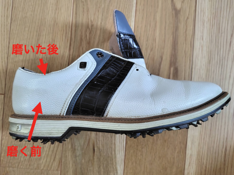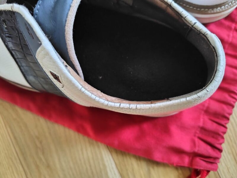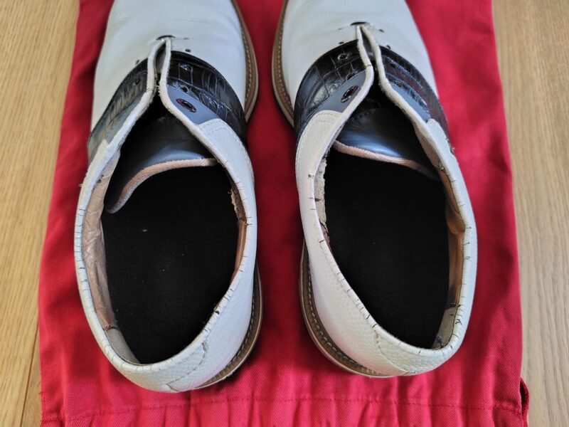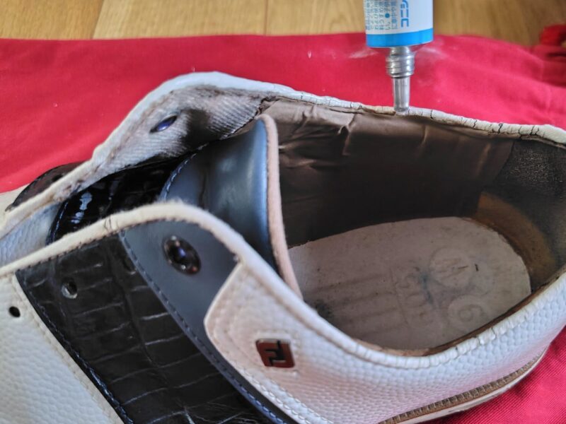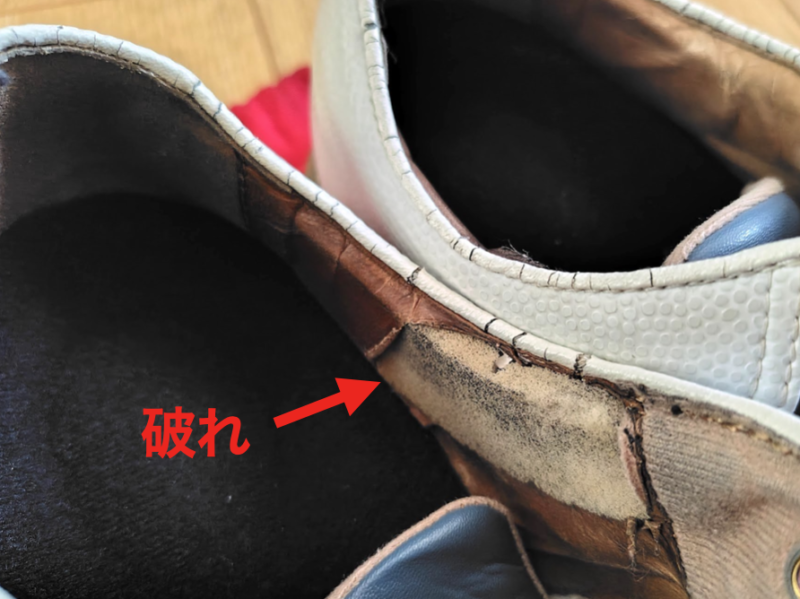 私が愛用しているゴルフシューズは、内側の革が破れてしまい、スポンジが見える状態となっていました。見た目が悪く気になっていたのですが、外側はまだキレイなので捨ててしまうのも、もったいないと感じていました。